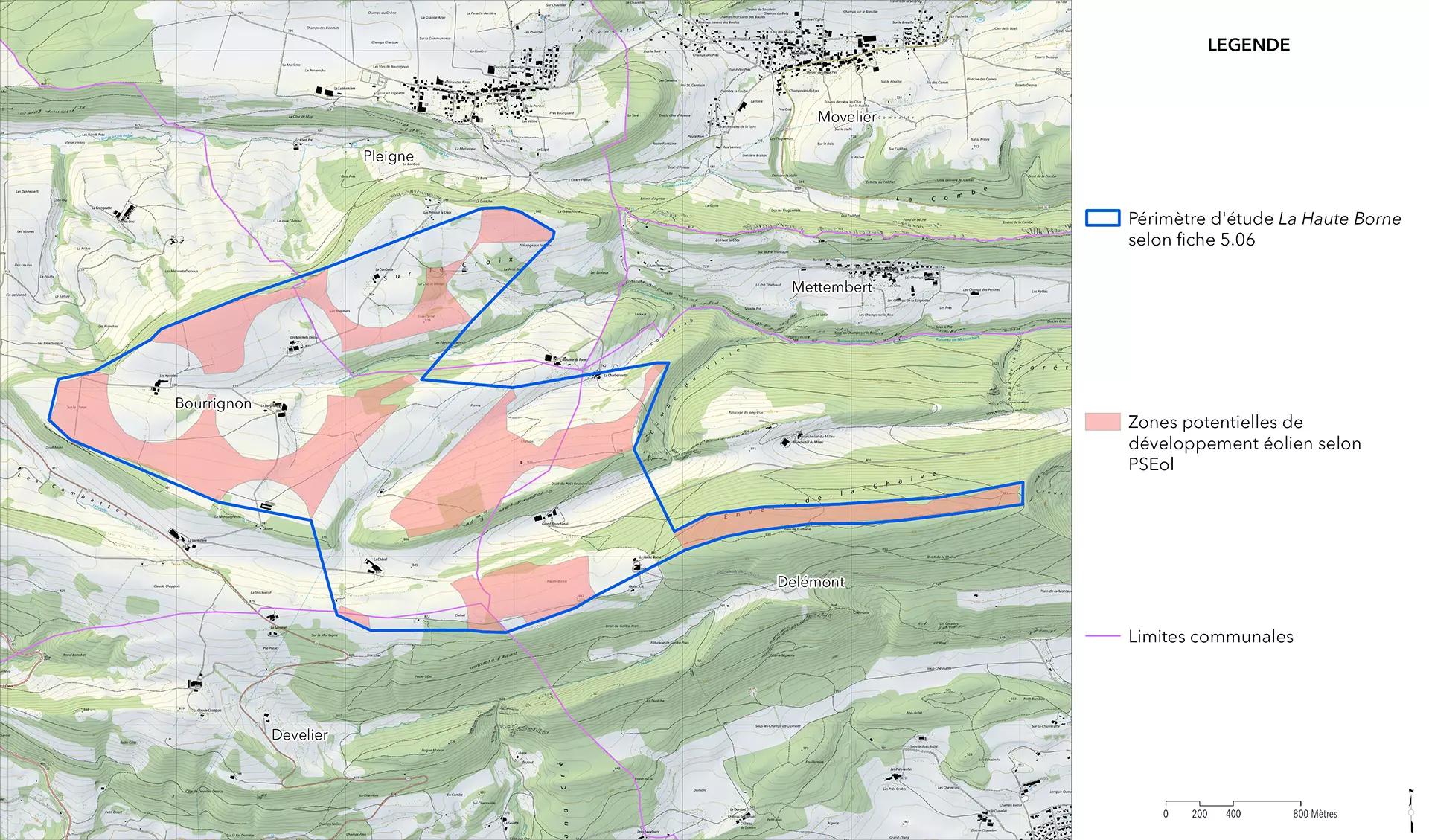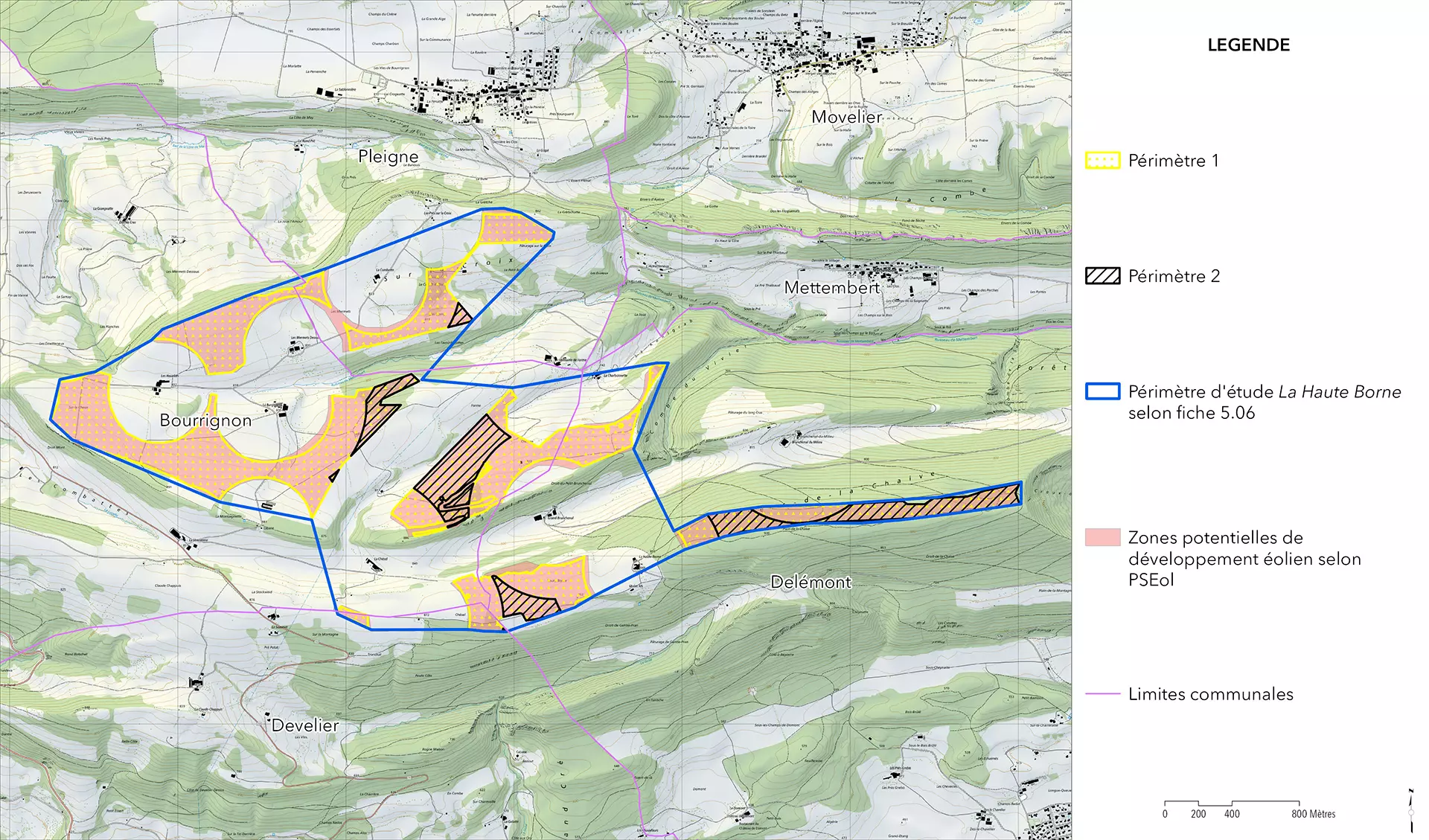 Le projet du parc éolien de la Haute Borne se situe sur les communes de Bourrignon, Delémont, Develier et Pleigne. L'ensemble du périmètre, situé à une altitude comprise entre 780 et 930 m, est composé de zones agricoles et forestières. Au total, les zones potentielles de développement éolien inscrites dans le plan sectoriel de l'énergie éolienne (PSEol) s'étendent sur une surface de près de 195 ha.